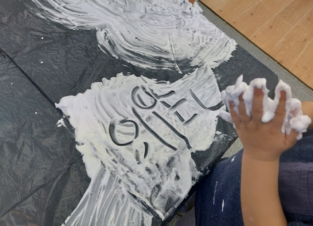Les Girafes i els Elefants hem fet una activitat molt divertida amb escuma, a més del plaer d'experimentar lliurement, hem aprofitat per fer grafismes. Hem pogut fer traços, el nostre nom, dibuixos...amb els dits o amb tota la mà. Hem gaudit moltíssim i hem fet coses molt xules! Si voleu veure els resultats cliqueu aquí.